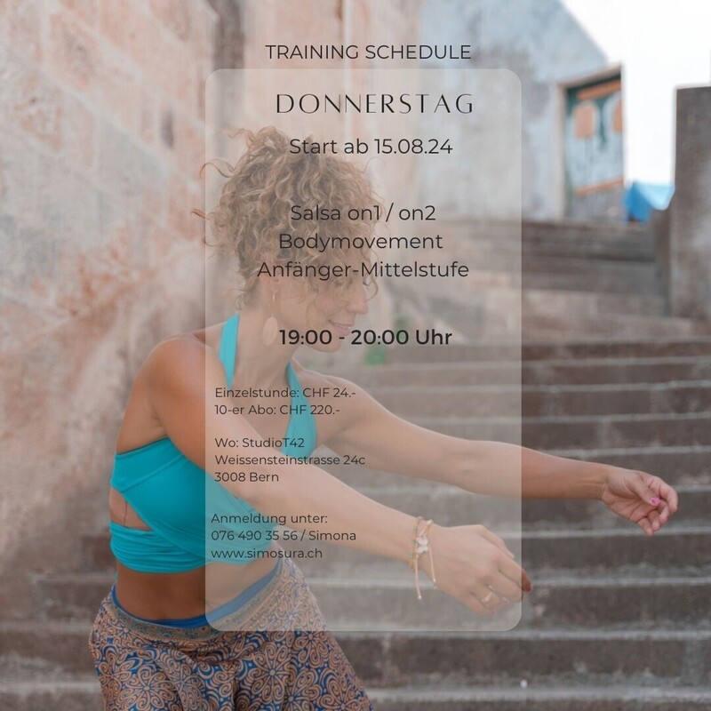 Bei diesem Kurs werden wir Grundbewegungen und Isolationskünste meistern, um sie später in heißem Social-Dance zu rocken. 🎉 Achtung, es wird heiß! 🔥 Das Warm-Up bringt dich zum Schwitzen, während du die Technik der Bewegungen im Detail erlernst. Und dann wird’s erst richtig spannend: Wir packen einfache bis mittelschwere Combos aus, schmeißen sie zur Musik und – tada! – wir tanzen, was das Zeug hält! 💃🕺 Es gibt aber auch ein bisschen extra Würze: Wir wechseln zwischen ON1 und ON2, vielleicht tanzen wir sogar beides gleichzeitig – weil wir's einfach drauf haben! 😎 Wer diese Herausforderung annimmt, wird belohnt – und zwar mit jeder Menge Spaß und einem strahlenden Lächeln im Gesicht! Jedermann ist herzlich willkommen! Willst du mal reinschnuppern? Ruf mich an oder schreib mir eine Nachricht auf 076 490 35 56. Tänzerische Grüsse Simosura www.simosura.ch