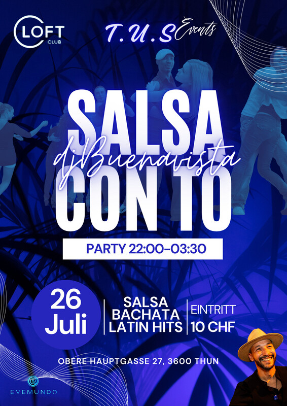 T.U.S Events (Timba . Urbano . Sensual) Loft 27 Freitag, 26. Juli 2024, 22:00 Uhr SALSA CON TO LOFT THUN Warst du bei diesem Event dabei? Lade deine Fotos hoch! 22:00-03:00 Dj BUENAVISTA Salsa bachata y mas Eintrittspreis: CHF 10.00 Share on Facebook Events