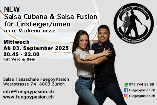 Salsa Cubana & Salsa Fusion – Einstieg für absolute Anfänger! Vero & Beni sind bekannt für ihre familiäre Atmosphäre und ihre Pionierarbeit in der Salsa-Szene. In unserem Einsteigerkurs lernst du Schritt für Schritt die Grundlagen von Salsa Cubana und Salsa Fusion – ganz ohne Vorkenntnisse. Mit viel Spaß und guter Musik begleiten dich die beiden vom Fuego y Pasion Team in deine erste Salsa-Reise. Entdecke rhythmische Moves, lerne die Basics des Tanzens und genieße das besondere Feeling auf der Tanzfläche! Werde Teil unserer Community und starte jetzt durch – wir freuen uns auf dich! www.fuegoypasion.ch