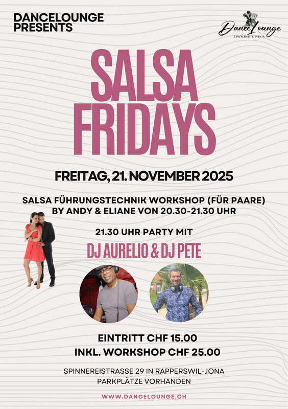 Salsa Fridays immer mit 2 DJ's (Manuel & Aurelio oder Pete & Aurelio), Salsa-Workshop von 20.30-21.30 Uhr mit Andy und Eliane. Niveau: Fortgeschritten, kostenlose Parkplätze hinter dem Haus. https://www.dancelounge.ch/events/