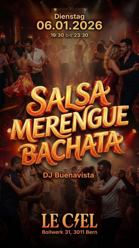 T.U.S Events (Timba . Urbano . Sensual) Le Ciel Club 1 Events Dienstag, 06. Januar 2026, 19:30 Uhr SALSA LE CIEL BERN Warst du bei diesem Event dabei? Lade deine Fotos hoch! BIG NEWS in Bern - Club Le Ciel Mach dich bereit für eine heiße Nacht voller Salsa, Merengue und Bachata! Dienstag, 06.01.2026 Von 19:30 bis 23:30 Uhr Club Le Ciel - Bollwerk 31, 3011 Bern DJ BUENAVISTA Eintritt: 10 CHF Eintrittspreis: CHF 10.00 Share on Facebook Events Di, 3. Mär 19:30 SALSA URBAN BACHATA BERN Le Ciel Club Bern