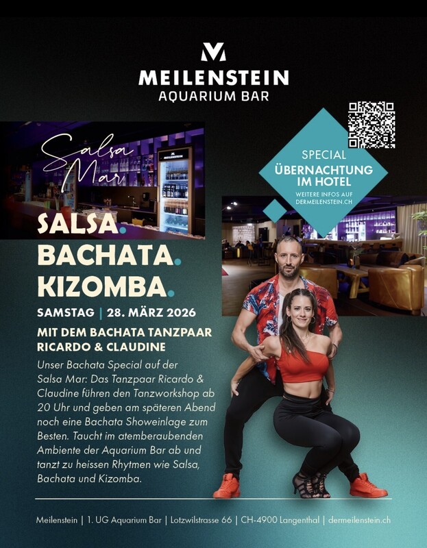 💃 Salsa Mar 💃. Mit DJ Ashé + Bachata Workshop und im späteren Abend eine Bachata Show mit Ricardo&Claudine 4 Salsa Cubana & Puerto 50/50 3 Bachata 2 Kizomba Die Bar im 1.UG ist das Glanzstück des Aquariums Langenthal. Süsswasserbecken auf 42 Metern Länge verzaubern die Gäste von der ersten Sekunde an. Unterwasserwelten vom Amazonas bis nach Siebirien mit atemberaubenden Flussmonstern und farbengewaltigen Amazonasfischen können hier trockenen Fusses bestaunt werden. Freuen Sie sich bei. 💃Salsa Mar💃 Auf einen Workshop für Tanzbegeisterte ab 20.00-20.45 und anschliessend 20.45 auf eine heisse Party In beeindruckender Kulisse bis 02.00 Workshop & Party. 27.- 20.00-02.00 /Party 17.- 20.45-02.00 💃 Bachata Workshop mit Ricardo & Claudine💃 Freundlich erwarte ich Dich auf eine weitere Unvergessliche Party Lg Reto & Team https://www.dermeilenstein.ch