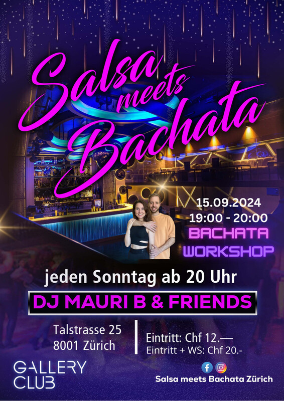 " Salsa meets Bachata" ist zurück auf dem Dancefloor ! Du weisst genau wohin du gehen musst wenn du den besten Sound hören willst. Wir freuen uns bereits riesig auf viele tolle Stunden mit euch, zu bestem Salsa, Bachata und Merengue. Jeden Sonntag, ab 20 Uhr im Gallery Club Zürich ( Talstrasse 25, 8001 Zürich) Diesen Sonntag: Bachata Workshop mit Patrick & Laura Start: 19 Uhr Best music, only killer, no filler ! See you there DJ Mauri & friends