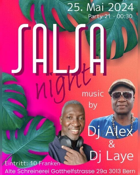 NOCHE DE SALSA IN DER ALTEN SCHREINEREI IN BERN MIT DJ LAYE UND DJ ALEX Hast du Lust Salsa zu tanzen? Dann komm am Samstag den 25.05.2024 ab 21 Uhr in die Alte Schreinerei in Bern und genieße den Abend in schöner Location mit guter Salsa Musik. Eintritt Party: 10 Franken. Location: ALTE SCHREINEREI, Gotthelfstrasse 29a, 3013 Bern facebook, instagram: kizomba bern