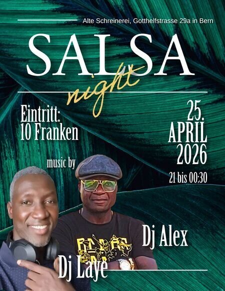 Salsa night in der Alten Schreinerei Am Samstag den 25.04.2026 ist die nächste Salsa night. 21 Uhr beginnt ein wunderbarer Abend mit Salsa von Dj Laye und Dj Alex. Kommt in die schöne Locationon der Alten Schreinerei in Bern und tanzt zusammen zu guter Musik. Eintritt Party: 10 Franken. Location: ALTE SCHREINEREI, Gotthelfstrasse 29a, 3013 Bern facebook, instagram: kizomba bern