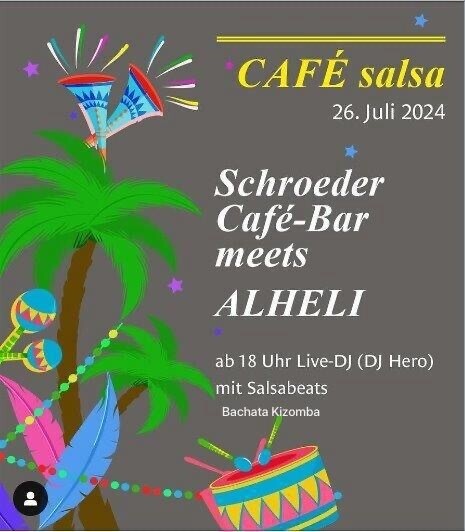 Lasst uns abtanzen und das Leben feiern am Freitag den 26.Juli im Café Bar Schroeder in Singen!!! Ab 18 Uhr mit Salsa, Bachata, Kizomba mit DJ Hero Infos: Phone 078 209 93 31 oder per Mail an info@ce-events.ch Wir freuen uns auf einen schönen Abend mit Euch! CE-EVENTS.CH