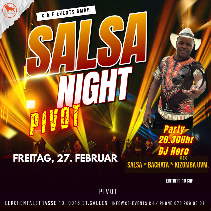 Lasst uns abtanzen und das Leben feiern am Freitag den 27. Februar im Pivot in St.Gallen!! Salsa Night Party ab 20.30 Uhr mit DJ Hero Salsa Bachata Kizomba Mambo Eintritt Party: 10 CHF Zahlungsmöglichkeit: Twint oder Cash. Keine Kartenzahlung möglich!! Infos: Phone 078 209 93 31 oder per Mail an info@ce-events.ch Parkplätze vor dem Haus und weitere an der Lerchentalstrasse 21 beim Stoffwechselzentrum Gästeparkplätze, weitere Gästeparkplätze auf dem Kiesplatz bei Altrimo und Stoffwechselzentrum!! Wir freuen uns auf einen schönen Abend mit euch!! www.ce-events.ch