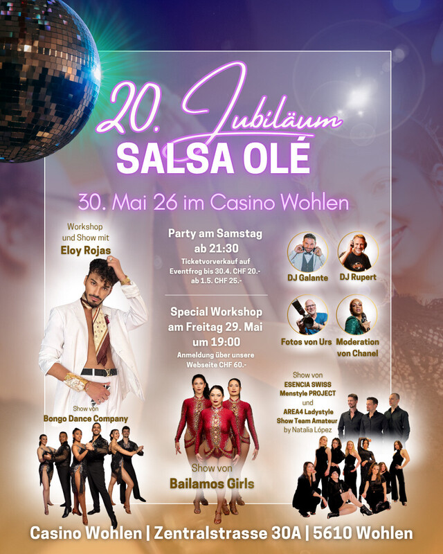Salsa Olé Party -> 20. JUBILÄUM!!! mit allem drum und dran 🙂 - Special Workshop am FREITAG 29.05. um 19:00 Uhr - Partystart am SAMSTAG um 21.30 Uhr mit Top DJs 𝗧𝗶𝗰𝗸𝗲𝘁𝘀 Party Bis 30.4. CHF 20.- und ab 1.5. CHF 25.- (via Eventfrog: https://eventfrog.ch/.../20-jubilaeum-salsa-ole...) Workshop CHF 60.- (via Webseite: www.salsaole.ch) 𝗜𝗻𝗳𝗼𝘀 𝘂𝗻𝗱 𝗔𝗻𝗺𝗲𝗹𝗱𝘂𝗻𝗴 info@salsaole.ch 076 323 98 81 www.salsaole.ch https://www.instagram.com/salsaole_wohlen www.salsaole.ch