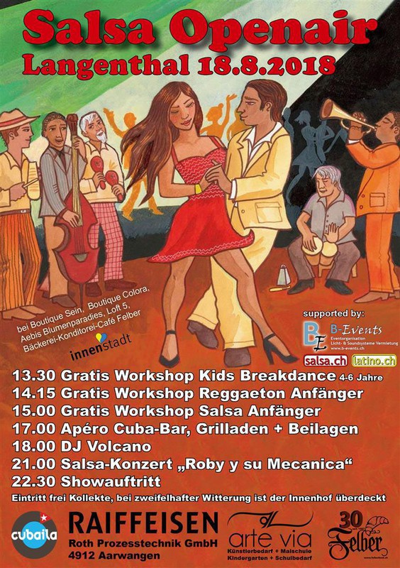 HERZLICHEN DANK ALLEN DIE DA WAREN!! Gratis Nachmittags-Workshops - 13.30 - 14.15 Mini-Kids Breakdance 4-6 Jahre - 14.15 - 15.00 Reggaeton für Jugendliche + Erwachsene - 15.00 - 15.45 Salsa cubano für Jugendliche + Erwachsene ab 17.00 Apéro und Nachtessen mit feinen Grilladen, Salate und weiteren Beilagen - Tanzbereit ab ca. 18.00 mit DJ Volcano - Livekonzert mit Roby y su mecania ca. 21.00 - Showauftritt ab ca. 22.30 Eintritt frei - Kollekte bei zweifelhafter Witterung ist der Innenhof überdeckt. WIR FREUEN UNS AUF EINE HEISSE SALSA NACHT MIT EUCH www.cubaila.ch