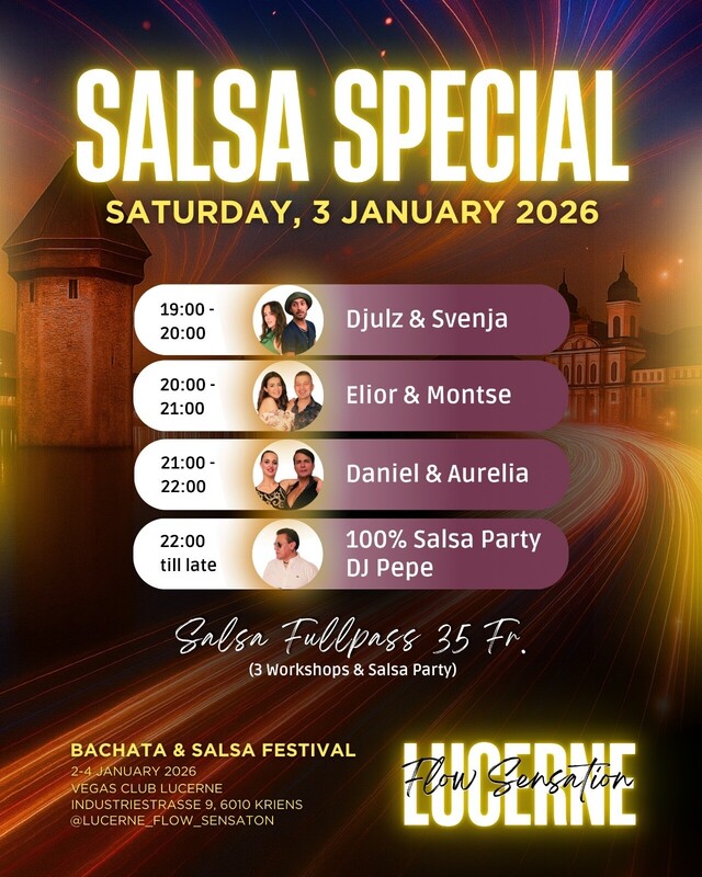 SATURDAY SALSA SPECIAL Salseros y salseras, get ready for a dedicated Salsa Floor and three workshops followed by a 100% Salsa Party! Saturday, January 3, 2026 19:00-20:00 Djulz & Svenja 20:00-21:00 Elior & Montse 21:00-22:00 Daniel & Aurelia 22:00 till open end 100% Salsa Floor with DJ Pepe Salsa Full Pass: 35 CHF (3 workshops + party) Bring your energy, your sabor, and your best moves — see you on the salsa floor at Lucerne Flow Sensation! https://eventfrog.ch/de/p/festivals/tanz/lucerne-flow-sensation-bachata-salsa-festival-3rd-ed-7371182283565317731.html