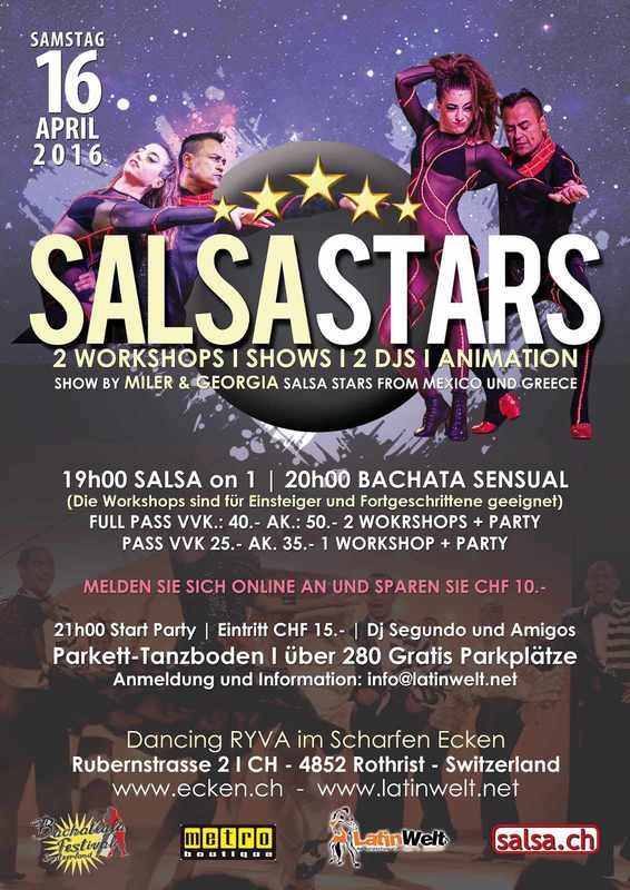 Latin Welt & Dancing RYVA präsentieren: SALSA STAR: Miler & Georgia (Mexico - Griechenland) 2 WORKSHOPS I SHOW I ANIMATION I PARTY DJ SEGUNDO & AMIGOS Erleben Sie schöne und glückliche Momente! 100% Salsa, Bachata, Kizomba, Semba, cha cha INSTRUKTOREN: Miler & Georgia (Profesionelle Tänzer) 19.00 - 19.50 Uhr - Salsa On 1 20.00 - 20.50 Uhr - Bachata Sensual 21.00 - 02.30 Uhr Party VORVERKAUF 2 Workshops inkl. Party CHF 40.- 1 Workshop inkl. Party VHF 25.- ABEND KASSE 2 Workshops inkl. Party CHF 50.- 1 Workshop inkl. Party VHF 35.- beide Workshops sind für Einsteiger und Fortgeschrittene geeignet, Der Workshops setzt Vorkenntnisse voraus. Eintritt CHF 15.- "Reservieren Sie ihr Eintrittsticket und sparen Sie bis CHF 10.-, Die Reservation gilt als Vorverkauf und wird vor Ort bezahlt." Haben Sie eine Latinweltkarte oder Latino Card gewähren wir Ihnen gerne einen Discount. Reservationen, Anmeldungen und Informationen: info@latinwelt.net I 078 800 49 12 I www.latinwelt.net Top Djs - Parkett Tanzboden - über 280 Gratis Parkplatz Wir freuen uns auf Ihren Besuch und auf einen unvergesslichen Salsa Abend. Dancing RYVA Team und LatinWelt.net
