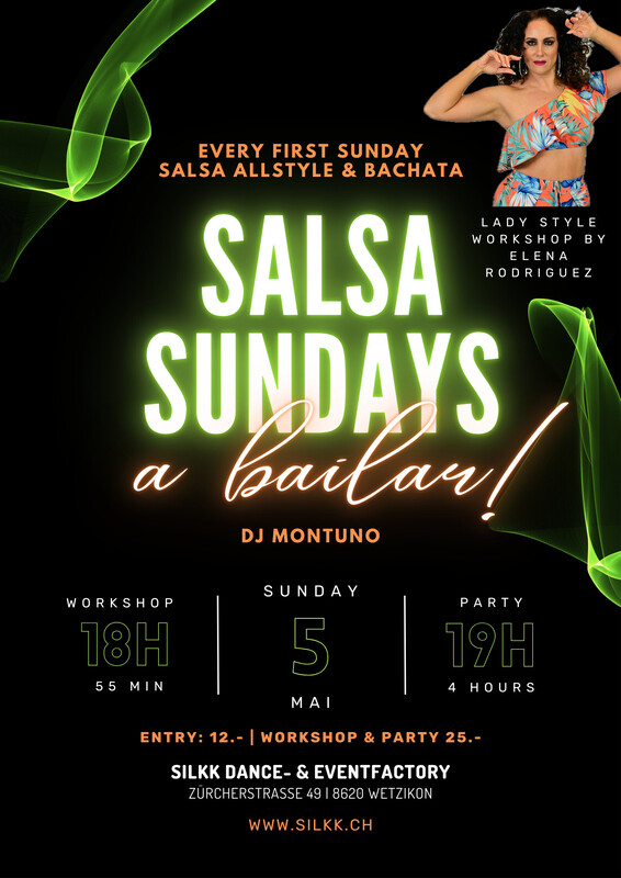 SALSA SUNDAYS – a bailar! Wir treffen uns immer am ersten Sonntag im Monat um gemeinsam einen Energie gelandenen Abend zu verbingen. Als Warm Up findet wie gewohnt ein Workshop statt und danach ist Social Dance mit feinstem Salsa und Bachata von DJ Montuno und weiteren bekannten nationalen DJ's angesagt. Wir freuen uns euch zu begrüssen. CU SOON! ________________________________________________________________ PREIS Eintritt: 12.- Workshop: 20.- Party und Workshop zusammen: 25.- PROGRAMM Workshop Time: 18:00 - 18:55 Social Dancing: 19:00 - 23:00 (Einlass 18:00 nur für Workshopteilnehmer. Partygäste ab 19:00 ❤) WORKSHOP INFOS Art: Salsa Ladies Style (Salsa Grundkenntnisse vorausgesetzt) Beschreibung: Elena nimmt dich mit in die Welt des Salsa Ladies Style. Profitiere von Elenas grosser Erfahrung und lerne, wie du als Frau weiblich und selbstsicher deine Salsa Styles ausführen kannst. Teacher: Elena Eylem Rodriguez MUSIC Salsa Allstyle und Bachata mit DJ MONTUNO NEXT DATES 2. Juni Juli & August Sommerpause 1. September 6. Oktober 3. November 1. Dezember https://www.silkk.ch/events/Salsa-Sunday-78-90-97-111