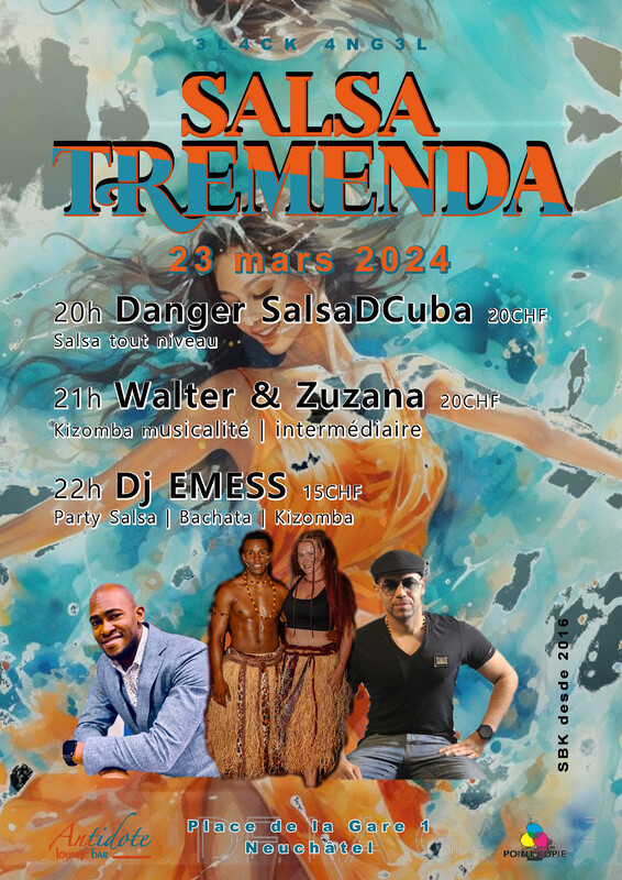 Salsa Tremenda - 23 mars 2024 SBK 20h Danger SalsaDcuba 20CHF salsa tout niveau 21h Walter & Suzana 20 CHF Kizomba musicalité Intermédiaire inscription par couple https://tinyurl.com/salsatremenda 22h dj Emess 15CHF #Salsa | #Bachata | #Kizomba @Antidote Lounge Bar | 3L4CK.4NG3L https://bit.ly/4civgDA