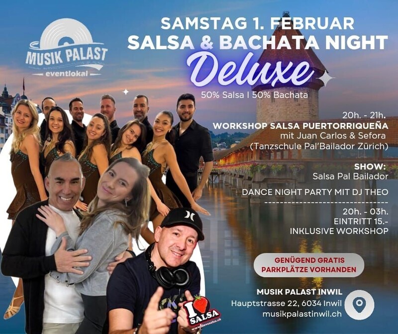 Samstag 1. Februar 2025 ------------------------------ SALSA & BACHATA NIGHT DELUXE ------------------------------------------ 50% Salsa I 50% Bachata MUSIK MIX MIT DJ THEO 20h. - 21h. WORKSHOP SALSA PUERTORRIQUEÑA Juan Carlos & Sefora (Tanzschule Pal'Bailador Zürich) 23:30h. SALSA SHOW Pal Bailador 20h.-03h. Eintritt 15.- inklusive Workshop & Party Genügend Gratis Parkplätze vorhanden MUSIK PALAST INWIL Hauptstrasse 22, 6034 Inwil www.musikpalastinwil.ch https://fb.me/e/4gg1ZNTiQ