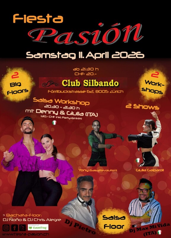Lerne neue Salsa Figuren mit Denny Imperiale & Giulia Galparoli (ITA) und tanze diese gleich anschliessend an der Fiesta Pasión ab 21:30 Uhr mit 2 grossen Floors (u.a. mit Salsa Floor by DJ Max Mi Vida (ITA) und DJ Pietro)! Workshop inkl. Party-Eintritt Fiesta Pasión für 30.- CHF Das erwartet dich... *4 Shows* (Start 23:45 Uhr) 23:45 Uhr Bachata-Floor - IK Couples Team - The Lioness Queens 00:15 Uhr Salsa-Floor - Giulia Galparoli (ITA) - Yony (SalsaRevolutión) Abendkasse oder Vorverkauf via Eventfrog: https://eventfrog.ch/de/p/kurse-seminare/musik-tanz/salsa-workshop-mit-denny-imperial-giulia-galparoli-ita-7436863902850248372.html