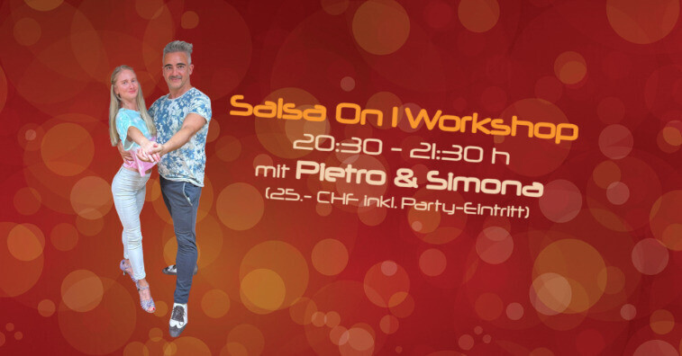 Lerne neue Salsa Figuren mit Pietro & Simona und tanze diese gleich anschliessend an der Fiesta Bachata ab 21:30 Uhr mit 3 Floors (u.a. mit Salsa Floor by DJ Pepe) Workshop inkl. Party-Eintritt Fiesta Bachata für 25.- CHF Abendkasse oder Vorverkauf via Eventfrog: https://eventfrog.ch/de/p/kurse-seminare/musik-tanz/salsa-on1-workshop-mit-tiago-valeria-vivebailando-7422765457424298139.html
