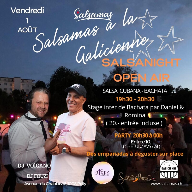 ⭐️Soirée Salsa Cubana & Bachata sous les étoiles avec Salsamas à La Galicienne ! ⭐️Quel plaisir de vous retrouver sur la piste, sous les étoiles ! 👉Rendez-vous les vendredis, à La Galicienne pour une ambiance caliente ! 👉 19h30 à 20h30 : Stage intermédiaire de Bachata donné par Daniel & Romina 20.- pour le cours (inclus l'entrée) 👉 20h30 à 00h00 : DJ Volcano & DJ Fouzi aux platines (et d’autres DJs à venir) Salsa & Bachata au rendez-vous ! ⭐️ Entrée : 10.- (5.- pour étudiant·e·s / AVS / AI) 👉 Dégustation sur place des empanadas et salade, Causa 🥗 👉parking collé à la Galicienne Plus d’infos : www.salsamas.ch