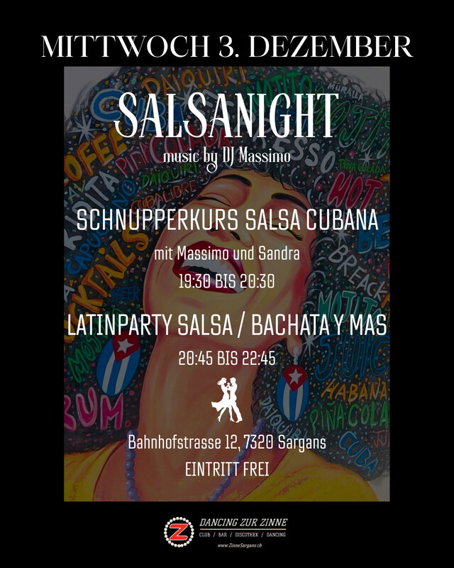 Wolltest du schon immer mal Salsa Cubana ausprobieren? Jetzt hast du die Möglichkeit! Komm am 3. Dezember in die Zinne Sargans, Massimo und Sandra bringen dir deine ersten Schritte bei. Die heissen Rhythmen werden dich in dieser kalten Jahreszeit schön aufwärmen. Danach heizt dir DJ Massimo mit seiner Musik ein und sorgt für gute Stimmung.