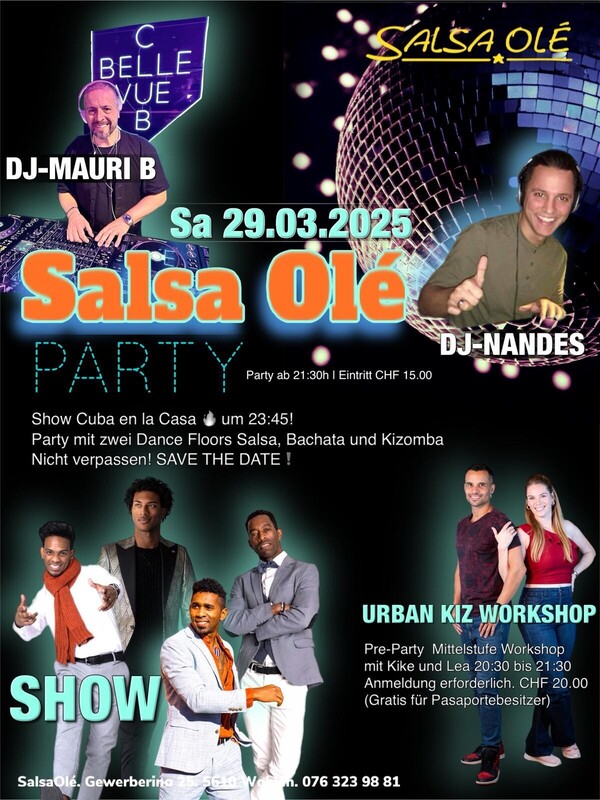 Salsa Olé Party mit 2 Floors! 1. Floor Salsa und Bachata mit DJ Mauri B 2. Floor Kizomba mit DJ Nandes Show, Pre-Party-Workshop & die härzlichsti, coolsti Stemmig wiit ond breit🥰 nur 20 Minute vo Züri oder 10 Minute von Lenzburg Workshop um 20.30 Uhr Partystart um 21.30 Uhr Preise Party und Workshop CHF 30.00 nur WS CHF 20.00 nur Party CHF 15.00 Infos und Anmeldung info@salsaole.ch 076 323 98 81 www.salsaole.ch