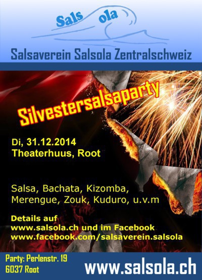Mit Salsa ins neue Jahr tanzen! Gemeinsam ein feines Essen geniessen und das neue Jahr mit einem Cüpli begrüssen. Unsere DJ's werden euch mit heissen Salsa-, Bachata-, Regaeton-, Merenque- und Kizomba-Rhythmen verwöhnen und das Parkett zum glühen bringen. Programm 19 Uhr: Türöffnung 20 Uhr: gemeinsames Essen, Fleisch und Vegi-Menü à discretion! ab 22 Uhr Salsa-Party (ohne Voranmeldung) Anmeldung zum Essen bis am 27.12.2014 auf unserer Webseite. Eintrittspreise VV mit Essen und Cüpli: Fr. 49.- / Mitglieder: Fr. 39.- AK mit Essen und Cüpli: Fr. 54.- / Mitglieder: Fr.44.- ab 22.00 Uhr mit Cüpli: Fr. 18.- / Mitglieder: Fr. 15.- ab 00.30 Uhr: Fr. 8.- / Mitglieder: Fr. 5.- Vorzugspreise bei Bezahlung bis am 20.12.2014 Details: http://www.salsola.ch/index.php/events/eventdetail/1941/-/salsola-silvesterparty Tel: 079 340 75 45 http://www.salsola.ch