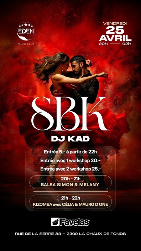 SBK PARTY & WORKSHOP WORKSHOPS - 20H - 21H : SALSA avec SIMON & MELANY - 21H - 22H : KIZOMBA avec MAURO D ONE & CELIA SBK PARTY DES 22H DJ KAD PRIX: PARTY 5.- 1 WORKSHOP + PARTY : 20.- 2 WORKSHOP + PARTY : 25.- ADRESSE: EDEN CLUB Rue de la Serre 83 2300 La Chaux De Fonds www.djkad.ch