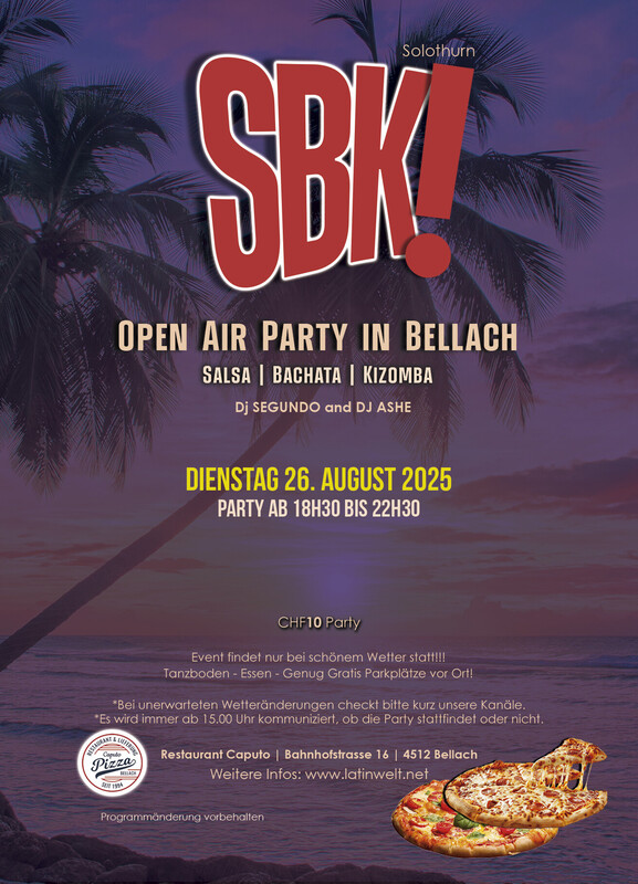 ⚠️ Der Event findet nur bei schönem Wetter statt. 👈🏽 Latinwelt präsentieren: ★SALSA, BACHATA, KIZOMBA OPEN AIR PARTY IN BELLACH Tanzfläche! Dj Segundo & Dj Ashe ★Zeit: 18:30 - 22.30 Uhr Party ★Preis: CHF 10.- Eintritt Party ★Informationen: - Tanzboden - Essen: Pizza 🍕 - Der Event findet nur bei schönem Wetter statt. - 15 Minuten zu Fuss vom bahnhof Bellach - 5 Minuten mit dem Auto von Solothurn - genug Parkplätze vor Ort weitere Informationen unter www.latinwelt.net Anmeldung nicht zwingend.