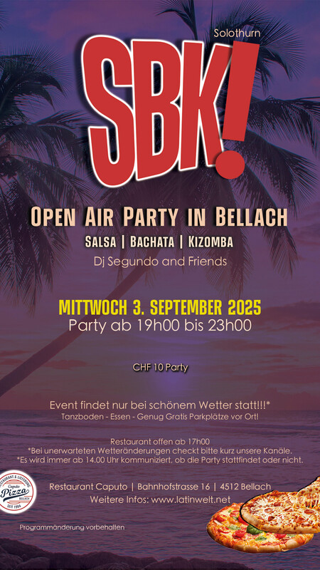 ⚠️ Der Event findet nur bei schönem Wetter statt. 👈🏽 Latinwelt präsentieren: ★SALSA, BACHATA, KIZOMBA OPEN AIR PARTY IN BELLACH Tanzfläche! Dj Segundo ★Zeit: 19:00 - 23.30 Uhr Party ★Preis: CHF 10.- Eintritt Party ★Informationen: - Tanzboden - Essen: Pizza 🍕 - Restaurant offen ab 17:00 Uhr - Der Event findet nur bei schönem Wetter statt. - 15 Minuten zu Fuss vom bahnhof Bellach - 5 Minuten mit dem Auto von Solothurn - genug Parkplätze vor Ort weitere Informationen unter www.latinwelt.net Anmeldung nicht zwingend.