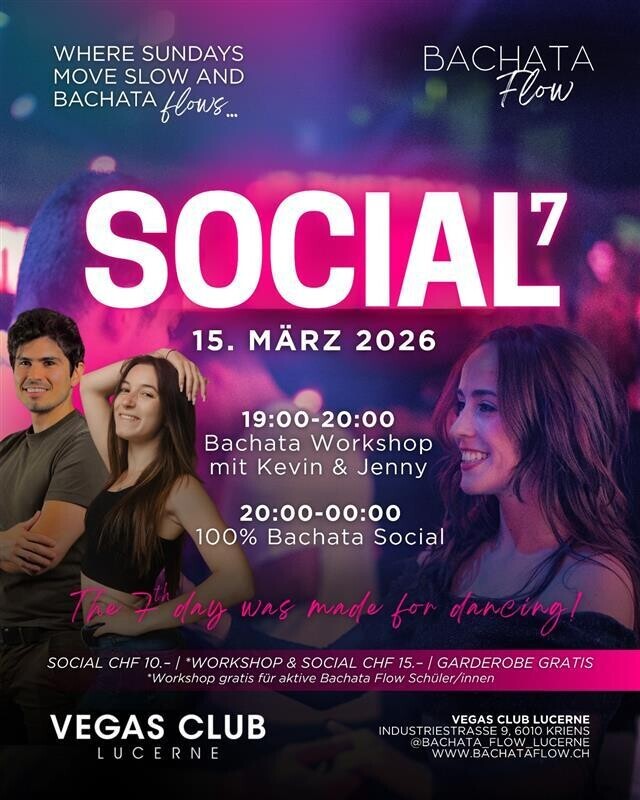 *SOCIAL7️⃣ – Sonntag, 15. März 2026* Dank eurem tollen Feedback gehen unsere gemütlichen Sonntags-Socials in Luzern in die nächste Runde! 🗓 15. März 2026 📍 Vegas Club Lucerne 🕢 19:00–20:00 Bachata Workshop mit Kevin & Jenny 🕣 20:00–00:00 Bachata Social 🎟 Abendkasse vor Ort Let the 7th day be your Bachata day! 🎶 https://www.instagram.com/p/DU8ihfbCBFk/?igsh=dTUwNmZmcTBpaXcy