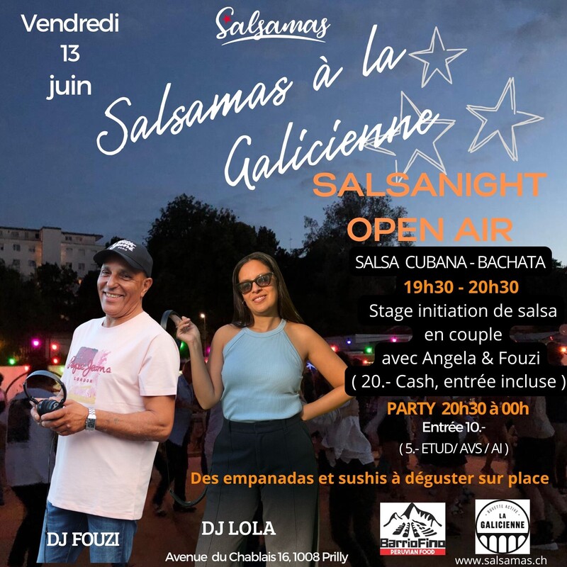 ⭐️Soirée Salsa & Bachata sous les étoiles avec Salsamas 2025 à La Galicienne ! ⭐️Quel plaisir de vous retrouver sur la piste, sous les étoiles ! 👉Rendez-vous les vendredis, à La Galicienne pour une ambiance caliente ! 👉 19h30 à 20h30 : Stage intro de salsa en couple avec Angela @ Fouzi 20.- pour le cours (inclus l'entrée) 👉 20h30 à 00h00 : DJ LOLA & DJ Fouzi aux platines (et d’autres DJs à venir) Salsa & Bachata au rendez-vous ! 👉 À déguster sur place des Empanadas et sushis. ⭐️ Entrée : 10.- (5.- pour étudiant·e·s / AVS / AI) Plus d’infos : www.salsamas.ch www.salsamas.ch