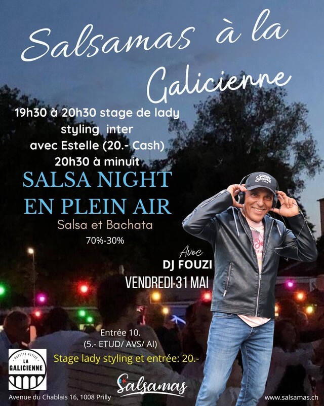 🇨🇺 Yeapaah, on attendait le retour des soirées en plein air, tous les vendredis du mois de mai dès le 10 mai. ⭐️ Soirée Salsa & Bachata en plein air Vendredi 31 mai 2024. ⭐️ Sous les étoiles, dans une ambiance magique🌟 💃🎉 ⭐️ De 19h30 à 20h30 stage de lady styling inter avec Estelle. ⭐️ De 20h30 à minuit soirée Salsa 70% & Bachata 30% avec DJFouzi aux platines.🔥🎉 ⭐️ Plongez dans l’ambiance en dégustant une sélection de cocktails, boissons rafraîchissantes et de bières glacées. Pour une pause gourmande, régalez-vous avec des collations savoureuses telles que des chips croustillantes, des gâteaux moelleux et des barres chocolatées. 🥨🍿🍩🍺🥂 ⭐️ Entrée 10.- / 5.- cash sur présentation carte étudiant et AVS-AI Stage lady Styling et entrée: 20.- 📍Adresse⤵️ Là Galicienne Avenue du Chablais 16 1008 Prilly www.salsamas.ch