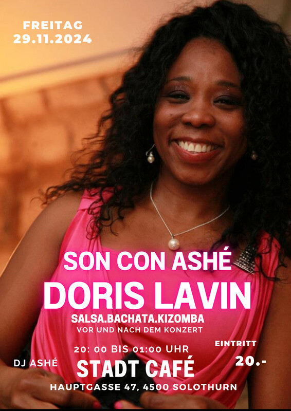 Wir laden Sie ein, zu tanzen und ein schönes Konzert kubanischer Musik zu genießen. Doris Lavin kubanische Sängerin mit einem großen musikalischen Repertoire. Salsa Party vor und nach dem Konzert 22:30 Uhr . Live konzert mit Doris Lavin Salsa . Bachata . Kizomba . Dj Ashé Wir freuen uns auf Euch . Eintritt: 20 CHF STADT CAFÉ Hauptgasse 47,4500 Solothurn