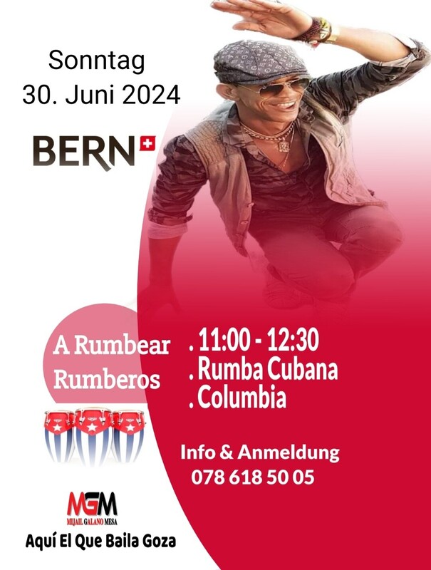 A Rumbearrrr Rumberos Sonntag in Bern Workshop Rumba Cubana - Columbia mit Mijail Galano 11:00 - 12:30 Rumba Cubana Columbia Info & Anmeldung 078 618 50 05 Aquí El Que Baila Goza www.mijailgalano.ch