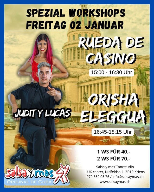 Feiertags - Special: Wir freuen uns sehr, einen tollen Workshop-Tag mit Judit Moreno und Lucas Beluzo anbieten zu können! FREITAG, 02. Januar 2026 15:00 – 16:30 Uhr: RUEDA DE CASINO Salsakenntnisse erforderlich 1 mal 90 min. für CHF 40.- 16:45 – 18:15 Uhr: ORISHA ELEGGUA kein Tanzpartner nötig 1 mal 90 min. für CHF 40.- Lust auf ein Doppelpack? Wer beide WS besucht, profitiert und bezahlt total nur CHF 70.- Kurslokal: Salsa y mas Tanzstudio, LUK Center, Nidfeldstrasse 1, 6010 Kriens (an der Stadtgrenze Luzern) Anmeldung: Anmeldung bitte rasch unter info@salsaymas.ch, Teilnehmerzahl ist beschränkt. Die Anmeldung ist verbindlich. Siehe auch www.salsaymas.ch für alle weiteren Kurse und Infos. Tanzschule Salsa y mas, Urbano Rodríguez Dubé Salsa y mas Tanzstudio LUK Center, Nidfeldstrasse 1 6010 Kriens (Luzern) Tel: 079 350 05 76 / 078 861 54 11 info@salsaymas.ch www.salsaymas.ch Jedes Jahr Tanzreisen nach Kuba! „…para que conozcas a Cuba!“ www.salsaymas.ch