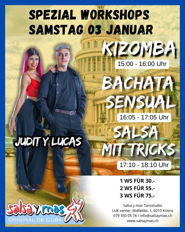 Feiertags - Special: Wir freuen uns sehr, einen tollen Workshop-Tag mit Judit Moreno und Lucas Beluzo anbieten zu können! SAMSTAG, 03. Januar 2026 15:00 – 16:30 Uhr: KIZOMBA 1 mal 60 min. für CHF 30.- 16:05 – 17:05 Uhr: BACHATA SENSUAL 1 mal 60 min. für CHF 30.- 17:10 – 18:10 Uhr: SALSA MIT TRICKS 1 mal 60 min. für CHF 30.- Lust auf mehr? Wer 2 WS besucht, bezahlt total 55.- und wer 3 WS besucht bezahlt CHF 75.- Kurslokal: Salsa y mas Tanzstudio, LUK Center, Nidfeldstrasse 1, 6010 Kriens (an der Stadtgrenze Luzern) Anmeldung: Anmeldung bitte rasch unter info@salsaymas.ch, Teilnehmerzahl ist beschränkt. Die Anmeldung ist verbindlich. Siehe auch www.salsaymas.ch für alle weiteren Kurse und Infos. Tanzschule Salsa y mas, Urbano Rodríguez Dubé Salsa y mas Tanzstudio LUK Center, Nidfeldstrasse 1 6010 Kriens (Luzern) Tel: 079 350 05 76 / 078 861 54 11 info@salsaymas.ch www.salsaymas.ch Jedes Jahr Tanzreisen nach Kuba! „…para que conozcas a Cuba!“ www.salsaymas.ch