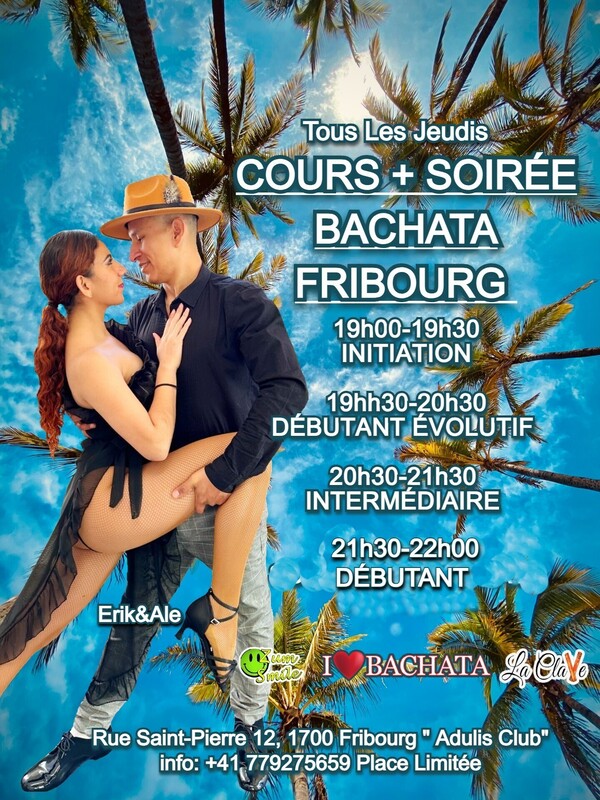 French-English Bonjour à tous les amis fribourgeois, Z.S Latin Dance présente : Un jeudi extraordinaire, un professeur de bachata latino-américain avec beaucoup d'expérience dans de nombreux pays d'Amérique du Sud et d'Europe. Erik Z.S. Il vient du Pérou. Programme: 19h00-19h30 débutant 0 19h30h-20h30 Débutant évolutif 20h30-21h30 Intermédiaire 21h30-22h00 débutant 0 Prix 20chf 1 séance Abonnements sur place : *4 sessions 80 CHF *Universitaires 4 sessions 50 CHF Vous pouvez utiliser deux séances le même soir. Info WhatsApp : +41 779275659 ou e-mail: Erikss9@hotmail.com , Place Limitée Rue Saint-Pierre 12, 1700 "Adulis Club" French-English French-English Hello to all my friends from Fribourg, Z.S Latin Dance presents: An extraordinary Thursday, a Latin American bachata teacher with a lot of experience in many countries in South America and Europe. Erik Z.S. He comes from Peru. Program: 19:00-19:30 beginner 0 19:30-20:30 Beginner progressive 20:30-21:30 Intermediate 21:30-22:00 beginner 0 Price 20chf 1 session Subscriptions on site: *4 sessions 80 CHF *University 4 sessions 50 CHF You can use two sessions the same evening. WhatsApp Info: +41 779275659 or e-mail: Erikss9@hotmail.com , Limited Place Rue Saint-Pierre 12, 1700 "Adulis Club" https://fb.me/e/2x0YC4Wlw