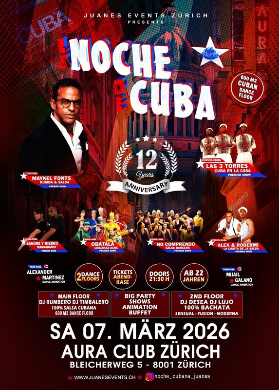 ● LA NOCHE DE CUBA ★ 12 Years Aniversary AURA Club. ● SAMSTAG 07 MÄRZ 2025 ● 2 DANCE FLOORS ★★★ Dieses Jahr feiern wir das 12-jährige Jubiläum von La NOCHE de CUBA im AURA Club Zürich, mit vielen schönen Überraschungen, Shows, Unterhaltung, Buffet und grosser Party. Am Samstag 07. März erwarten wir Sie zu einer Nacht voller Freude und purer Energie in einer einzigartigen kubanischen Atmosphäre, geschaffen von Juanes. ★★★ ● DOORS: 21:30 – 04:00 UHR ● EINTRITT CHF 25.- ● GARDEROBE IM 1. STOCK ● EINTRITT: BEZAHLUNG AN DER KASSE NUR BARGELD ● GETRÄNKE-BAR: BARGELD & CREDITCARD ★★★ CUBAN SHOWS BY: ● PREMIER SHOWS MAYKEL FONTS (Cuba-Italy) ● PREMIER SHOWS: LAS TRES TORRES (Zürich) ● PREMIER SHOWS: ALEXANDER & ROBERMI (Zürich) ● PREMIER SHOWS: FLUIR SALSADANCERS (Bern) ● PREMIER SHOWS: LUEDMILA OBATALA U OSHUN( Bern) ● PREMIER SHOWS: AFRO CUBAN GROUP BY WANNADANCE (Luzern) ★★★ DANCE ANIMATION BY: ● MAYKEL FONTS (Cuba-It) ● ALEXANDER MARTINEZ (Cuba) ● MIJAIL GALANO (Cuba) Während der Shows wird die Musik im anderen Dance Floor nicht aufhören, sondern ohne Pause weiterlaufen. ★★★ ● GRATIS BUFFET GEÖFFNET AB 00:30 UHR NACH DER SHOWS & ANIMATION ● Chicken Wings ● Gemischte Salate ● Fingerfood ● Guacamole mit Tortilla Chips ● Sandwiches ● Früchte ● Snacks und mehr Das BUFFET wird automatisch um 00:30 Uhr geöffnet, sobald die letzte Show vorbei ist. Die Animation kann weitergehen, aber das Buffet wird pünktlich um 00:30 Uhr geöffnet. ★★★ ★ 1-MAIN FLOOR: ★ LA NOCHE CUBANA ★v 600 M2 Dance Floor DJ RUMBERO DJ TIMBALERO 100% Salsa Cubana - Timba – Rumba - Salsaron - Fiesta ★★★ ★ 2ND FLOOR: BACHATA: DJ DESEA DJ LUJO 100% Bachata Fusion, Moderna, Clasica, del Recuerdo ★★★ EINTRITT CHF 25.- Du kannst Dein SPECIAL TICKET in Deiner Tanzschule oder bei Salsa, Bachata, Kizomba, Zouk, DJs & Partners bestellen, es in Deinem Handy aufbewahren, an der Kasse vorzeigen und Du erhältst einen Rabatt von CHF 5.- Das Ticket-Special können Sie ab dem 01.03.2026 bestellen. ★★★ Die Bar del Aura wird geöffnet sein und mit dem Club verbunden sein, damit Sie einen weiteren Raum zum Tanzen genießen und eine Zigarre rauchen können. ★★★ AURA CLUB Zürich Bleicherweg 5 8001 Zürich ★★★ Bienvenidos Juanes Events