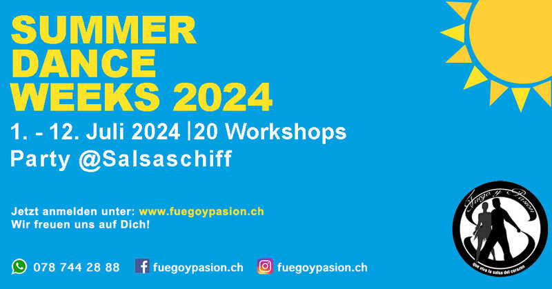 Summer Dance Weeks 2024: Tanze mit uns durch den Sommer und probiere verschiedene Tanzstile aus! Workshop-Programm Summer Dance Weeks 2024 Vom 1. bis zum 14. Juli 2023 stehen unsere Türe allen Tanzbegeisterten offen, die gerne Neues ausprobieren oder einfach mal uns und unsere Tanzschule kennenlernen möchten. www.fuegoypasion.ch