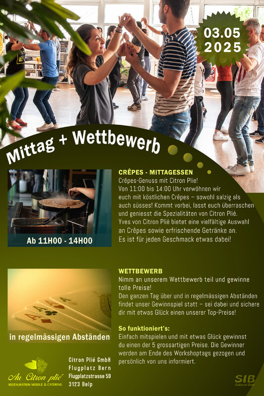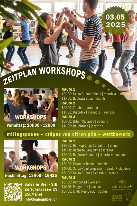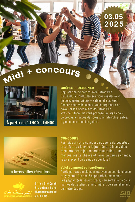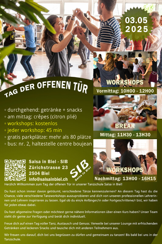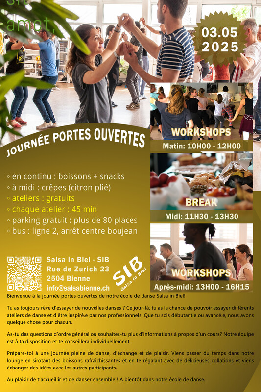 Herzlich Willkommen zum Tag der offenen Tür in unserer Tanzschule Salsa in Biel! Du hast schon immer davon geträumt, verschiedene Tänze kennenzulernen? An diesem Tag hast du die Chance, viele verschiedene Tanzworkshops auszuprobieren und dich von unseren professionellen Lehrerinnen und Lehrern inspirieren zu lassen. Egal ob du ein/e Anfänger/in oder Fortgeschrittene/r bist, wir haben für jeden etwas dabei. Du hast allgemeine Fragen oder möchtest gerne nähere Informationen über einen Kurs haben? Unser Team steht dir gerne zur Verfügung und berät dich individuell. Freue dich auf einen Tag voller Tanz, Austausch und Genuss. Verweile bei unserer Lounge mit erfrischenden Getränken und leckeren Snacks und tausche dich mit anderen Teilnehmern aus. Wir freuen uns darauf, dich bei uns begrüssen zu dürfen und gemeinsam zu tanzen! Bis bald bei uns in der Tanzschule. ✨✨✨✨✨ ◦ durchgehend: getränke + snacks ◦ mittagessen: crêpes “salzig + süsses” (citron plié) ◦ workshops: kostenlos ◦ jeder workshop: 45 min ◦ gratis parkplätze: mehr als 80 plätze ◦ bus: nr. 2, haltestelle centre boujean ✨✨✨✨✨ ZEITPLAN WORKSHOPS VORMITTAG 10:00 - 12:00 RAUM 1 10H00: Salsa Cubana Basic | maurizio + ramona 11H00: Bachata Basic | chanh RAUM 2 10H00: Zumba | fernanda 11H00: Discofox | maurizio + ramona RAUM 3 10H00: Urban Kizomba | dedinho 11H00: Bauchtanz | jacynthe NACHMITTAG 13:00 - 16:15 RAUM 1 13H00: Hip Hop 7 bis 17 Jahren | diana 14H00: Bachata Lady Style | lorenna 15H00: Bachata Sensual | ricardo + claudine RAUM 2 13H00: Kizomba Basic | melanie 14H00: Salsa Puertoriqueña | ricardo + claudine 15H00: Salsa Rueda Basic | chanh + lorenna RAUM 3 13H00: Dancehall | yorcely 14H00: Reggaeton | eveline 15H00: Lindy Hop Basic | sophie ✨✨✨✨✨ CRÊPES - MITTAGESSEN Crêpes-Genuss mit Citron Plie! Von 11:00 bis 14:00 Uhr verwöhnen wir euch mit köstlichen Crêpes – sowohl salzig als auch süsses! Kommt vorbei, lasst euch überraschen und geniesst die Spezialitäten von Citron Plié. Yves von Citron Plié bietet eine vielfältige Auswahl an Crêpes sowie erfrischende Getränke an. Es ist für jeden Geschmack etwas dabei! ✨✨✨✨✨ WETTBEWERB Nimm an unserem Wettbewerb teil und gewinne tolle Preise! Den ganzen Tag über und in regelmässigen Abständen findet unser Gewinnspiel statt – sei dabei und sichere dir mit etwas Glück einen unserer Top-Preise! So funktioniert’s: Einfach mitspielen und mit etwas Glück gewinnst du einen der 5 grossartigen Preise. Die Gewinner werden am Ende des Workshoptags gezogen und persönlich von uns informiert. 🇫🇷 🇫🇷 🇫🇷 🇫🇷 🇫🇷 Bienvenue à la journée portes ouvertes de notre école de danse Salsa à Bienne ! Tu as toujours rêvé de découvrir différents styles de danse ? Ce jour-là, tu auras l’occasion d’essayer de nombreux ateliers de danse et de te laisser inspirer par nos professeurs professionnels. Que tu sois débutant(e) ou déjà avancé(e), il y en aura pour tous les niveaux. Tu as des questions générales ou tu souhaites obtenir plus d’informations sur un cours en particulier ? Notre équipe est à ta disposition pour te conseiller de manière personnalisée. Tu as des questions générales ou tu souhaites obtenir plus d’informations sur un cours en particulier ? Notre équipe est à ta disposition pour te conseiller de manière personnalisée. Prépare-toi à une journée remplie de danse, d’échanges et de plaisir. Détends-toi dans notre espace lounge avec des boissons rafraîchissantes et des snacks savoureux, et profite de l’occasion pour discuter avec d’autres participant(e)s. Nous nous réjouissons de t’accueillir chez nous et de danser ensemble ! À très bientôt dans notre école de danse. ✨✨✨✨✨ ◦ en continu : boissons + snacks ◦ déjeuner : crêpes “salées + sucrées” (citron plié) ◦ ateliers : gratuits ◦ chaque atelier : 45 minutes ◦ parking gratuit : plus de 80 places disponibles ◦ bus : ligne 2, arrêt centre boujean ✨✨✨✨✨ HORAIRE DES ATELIERS MATIN 10h00 - 12h00 SALLE 1 10H00: Salsa Cubana Basic | maurizio + ramona 11H00: Bachata Basic | chanh SALLE 2 10H00: Zumba | fernanda 11H00: Discofox | maurizio + ramona SALLE 3 10H00: Urban Kizomba | dedinho 11H00: Dance du ventre | jacynthe APRÈS-MIDI 13h00 - 16h15 SALLE 1 13H00: Hip Hop 7 à 17 ans | diana 14H00: Bachata Lady Style | lorenna 15H00: Bachata Sensual | ricardo + claudine SALLE 2 13H00: Kizomba Basic | melanie 14H00: Salsa Puertoriqueña | ricardo + claudine 15H00: Salsa Rueda Basic | chanh + lorenna SALLE 3 13H00: Dancehall | yorcely 14H00: Reggaeton | eveline 15H00: Lindy Hop Basic | sophie ✨✨✨✨✨ CRÊPES - DÉJEUNER Dégustation de crêpes avec Citron Plié ! De 11h00 à 14h00, venez savourer de délicieuses crêpes – salées et sucrées ! Laissez-vous surprendre et régalez-vous avec les spécialités de Citron Plié. Yves de Citron Plié vous proposera un large choix de crêpes ainsi que des boissons rafraîchissantes. Il y en aura pour tous les goûts ! ✨✨✨✨✨ CONCOURS Participe à notre concours et gagne de superbes prix ! Tout au long de la journée et à intervalles réguliers, notre jeu-concours aura lieu – ne manque pas ta chance et, avec un peu de chance, repars avec l’un de nos super lots ! Voici comment ça fonctionne : Participe tout simplement et, avec un peu de chance, tu gagneras l’un des 5 super prix à remporter. Les gagnant(e)s seront tiré(e)s au sort à la fin de la journée des ateliers et informé(e)s personnellement par notre équipe. https://www.salsainbiel.ch/tag-der-offenen-tuer/