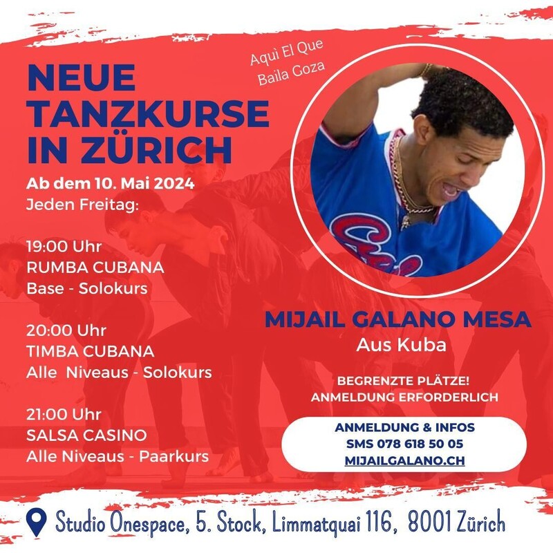 Mijail Galano Mesa Studio OneSpace 10 maggio 2024 18:00 corso Tanzkurse in Zurich mit Mijail Galano Sei stato a questo evento? Aggiungi le tue foto! Rumba, Timba, Casino www.mijailgalano.ch Share on Facebook Eventi