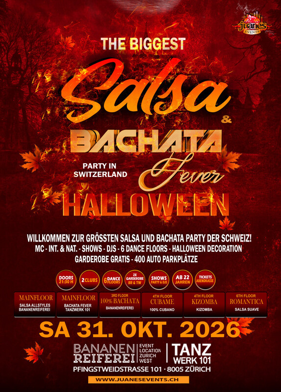 THE BIGGEST SALSA AND BACHATA FEVER 🎃 HALLOWEEN 🎃 PARTY IN SWITZERLAND SAMSTAG 31. OKTOBER 2026 BANANENREIFEREI & TANZWERK 101 ZÜRICH 🎃🎃🎃 ● AB 22 JAHREN ● 2 GROSSE CLUBS ● 6 DANCE FLOORS ● TICKETS ABENDKASSE ● DOORS: 21:30 – 04:00 UHR ● 7 TOP SALSA, BACHATA, CUBA, KIZOMBA DJS ● TOP NATIONAL PREMIER SHOWS ● EINTRITT: BEZAHLUNG AN DER KASSE NUR BARGELD. ● GETRÄNKE-BAR: BARGELD & CREDITCARD. ● 2 GRATIS GARDEROBE ● 2 HAUPTEINGÄNGE ● 300 AUTO PARKPLÄTZE ● HALLOWEEN DEKORATIONEN 🎃🎃🎃 Herzlich willkommen zur GRÖSSTEN SALSA & BACHATA Halloween Party der Schweiz. Einmal mehr heissen wir HALLOWEEN 2026 willkommen, ein spezielles Datum und die meist erwartete Party, sie bringt uns viele Überraschungen mit vielen Kreationen der erkleidungen und Schminke. Eine spektakuläre Nacht der Hexen, Sie kommen in Ihrer besten Kreation, gruseliger Schminke und Kostüm. Ohne Zweifel, SALSA HALLOWEEN wird eine unvergessliche Party, Horror und wo alle viel Spass haben werden. Herzlichen Dank an unser tolles Publikum, dass Ihr uns immer die Energie gibt, Freundschaft, Vertrauen und Liebe. 🎃🎃🎃 WORKSHOP PLAN AB 20:30 UHR ● 20:30 bis 21:30 Uhr Tanzwerk 101 ● ARTIST: ALMA & LUIS von BACHASUAVE ● STYLE: BACHATA FLOW ● LAVEL: IINTERMEDIATE ●●●● ● 20:30 bis 21:30 Uhr Bananenreiferei ● ARTIST: ● STYLE: ● LAVEL: **** Sie brauchen nicht zu buchen, kommen Sie direkt zum Club Bananenreiferei am Samstag 31. Oktober 2026 um 20:15 Uhr. Der Workshop Preis ist CHF 30.- Inkl. Garderobe & Party. 🎃🎃🎃 ● SHOWS 00:00 Uhr IN BANANENREIFEREI ● MC: LUIZ VAZQUEZ ● GUEST SHOW: by ● SHOW: by ● SHOW: by ● SHOW: by ● SHOW: by ● SHOW: by 🎃🎃🎃 Während der Shows wird die Musik im anderen Dance Floor nicht aufhören, sondern ohne Pause weiterlaufen. 🎃🎃🎃 MAIN FLOOR: SALSA ALLSTYLES>> BANANENREIFEREI >> 368 m² Dance Floor DJ RUMBERO DJ DJ Salsa Allstyles - Clasica – Puertorriqueña - Salsa Pal Bailador. 🎃🎃🎃 MAIN FLOOR: BACHATA FEVER>> TANZWER 101 >> 371 m² Dance Floor DJ HUSKY (Barcelona) DJ DESEA DJ LUJO 100% Bachata Fusion, Sensual, Moderna, Clasica, del Recuerdo 🎃🎃🎃 3RD FLOOR SENSUAL>> (Bananenreiferei) DJ ÑOÑO Bachata Sensual & Remix 🎃🎃🎃 4TH FLOOR CUBANO>> (Bananenreiferei) DJ 100% Salsa Cubana / Timba / Cubaton / Fiesta 🎃🎃🎃 5th FLOOR: KIZOMBA>> (Bananenreiferei) DJ Kizomba Semba Tarraxinha Urban Kiz 🎃🎃🎃 6th FLOOR: ROMANTICA>> (Bananenreiferei) DJ U.S. THALER 🎃🎃🎃 AUF DEM DACH DER BANANENREIFEREI & TANZWERK 101 HABEN WIR PARKPLÄTZE FÜR 400 AUTOS. 🎃🎃🎃 Eintritt CHF 25.- Inkl. 6 Dance Floors & 2 Garderobe Gratis 🎃🎃🎃 ✯ Du kannst Dein SPECIAL TICKET in Deiner Tanzschule oder bei Salsa, Bachata, Kizomba, Zouk, DJs & Partners bestellen, es in Deinem Handy aufbewahren, an der Kasse vorzeigen und Du erhältst einen Rabatt von CHF 5.- >>Bitte beachten Sie, dass der Gutschein im Wert von CHF 5.- nicht für die Workshops gültig ist, sondern nur für die Party. 🎃🎃🎃 2 EINGÄNGE UND KASSEN: 1. BEI BANANENREIFEREI: KASSE UND GARDEROBE, Sie können durch die Bananenreiferei eintreten, dort haben wir eine Kasse und Garderobe. 2. BEIM TANZWERK 101: KASSE UND GARDEROBE, Sie können über das Tanzwerk 101 eintreten, dort haben wir eine Kasse und Garderobe. 🎃🎃🎃 LOCATION: BANANENREIFEREI & TANZWERK 101 Pfingstweidstrasse 101 8005 Zürich 🎃🎃🎃 Beinvenidos Juanes Events https://juanesevents.ch/2-0-Events.html