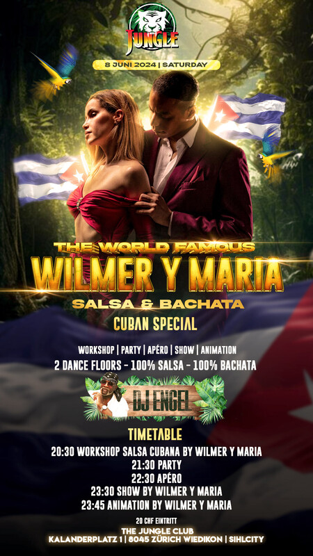 SAMSTAG, 8. JUNI 2024 SALSA & BACHATA EVENT CUBAN SPECIAL The Jungle Meets Cuba * WILMER Y MARIA * * SPECIAL GUESTS FROM CUBA * * WORKSHOP & SHOW * * 2 FLOORS * * APÉRO * 2 Dance Floors 100% Salsa 100% Bachata DJ Engel (Cuba) Timetable 20:30 Workshop SALSA CUBANA by WILMER Y MARIA 21:30 Party 22:30 Apéro 23:30 Show by WILMER Y MARIA 23:45 Animation by WILMER Y MARIA Workshop | Party | Apéro | Show | Animation 20 CHF Eintritt ​​THE JUNGLE CLUB Kalanderplatz 1 | 8045 Zürich Wiedikon | Sihlcity https://thejungleclub.ch/next-events.html
