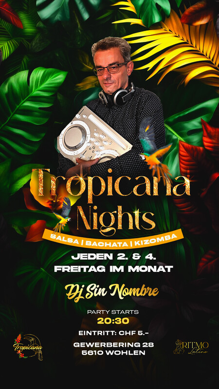 Jeden 2. & 4 Freitag Abend wird im Tropicana getanzt! Der Eintritt ist nur CHF5.- und ab 20.30 Uhr in Wohlen im Aargau wird ordentlich gefeiert. Es ist ein exklusiver Abend, welcher voller positiven Vibes, Spass und Lebensfreude dominiert wird, wo man in Ruhe üben/trainieren und sich unter Tänzer austauschen kann. Nimm deine Liebsten mit und geniesse die erstklassige Atmosphäre in Wohlen im Tropicana. Gratis Garderobe Es stehen ca. 40 gratis Aussenparkplätze vor dem Eingang und weitere 30 gebührenpflichtige in unmittelbarer Nähe zur Verfügung. Das Tropicana befindet sich im Industriegebiet und hat genügend Platz für alle Besucher. Du findest nicht alle Infos auf dem Flyer? Gerne kannst du uns über info@tropicanaclub.ch kontaktieren. === TROPICANA === Gewerbering 28 | 5610 Wohlen | Aargau