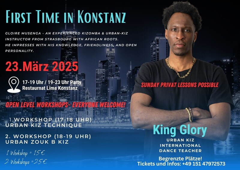 🔥 Erstmalig in Konstanz: Urban Kiz mit King Glory! 🔥 Am 23. März 2025 hast du die Gelegenheit, mit Gloire Musenga, bekannt als King Glory, zu tanzen und zu lernen! Dieser erfahrene Urban-Kiz- und Kizomba-Instructor aus Straßburg mit afrikanischen Wurzeln wird dich mit seiner Expertise, Freundlichkeit und offenen Persönlichkeit begeistern🤩 📍 Location: Restaurant Lima, Konstanz 🕔 Workshops & Party: 🔹 17:00 - 18:00 Uhr: Urban Kiz Technik 🔹 18:00 - 19:00 Uhr: Urban Zouk meets Kiz 🔹 19:00 - 23:00 Uhr: Party – Lass uns gemeinsam tanzen! 🎟 Preise: ✔ 1 Workshop = 15€ ✔ 2 Workshops = 25€ 💃🕺 Offenes Level – Jeder ist willkommen! Keine Erfahrungen in Zouk nötig! Nutze diese besondere Gelegenheit, deine Tanzskills zu verbessern und neue Moves zu lernen. Privatstunden am Sonntag sind möglich! 📞 Sichere dir jetzt deinen Platz! Begrenzte Teilnehmerzahl – Tickets & Infos unter: +49 151 47972573 - Spontanes vorbeikommen ist nur möglich, wenn noch genug Plätze frei sind Mach dich bereit für einen unvergesslichen Tanzabend mit King Glory! 🔥✨