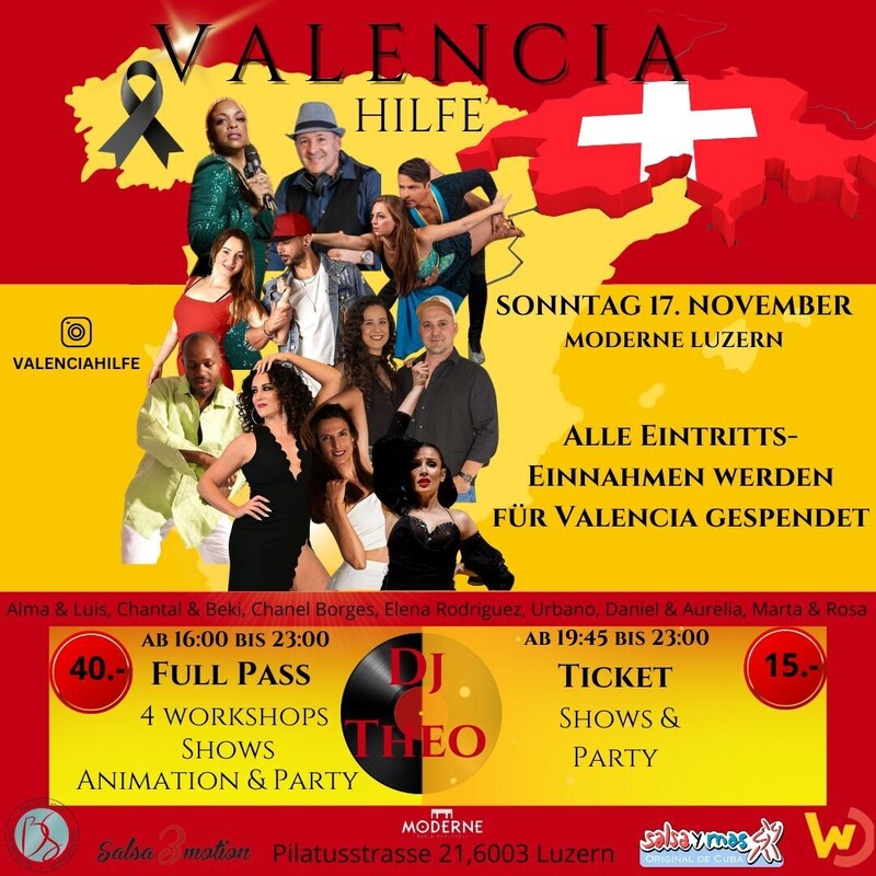 Salsa & Bachata Solidaritätsveranstaltung mit Workshops, Shows und Party, um Spendengelder für die Flutopfer in Valencia zu sammeln. Unterstütze die Hilfe! Transparenz garantiert. Programm: 16:00 bis 20:00 Workshops 16:00 - 16:45 Salsa Pasitos mit Urbano (Open Level) 16:55 - 17:40 Bachata Lady Style mit Marta & Rosa (Open Level) 17:50 - 18:35 Salsa Paartanz mit Chantal & Beki (Open Level) 18:45 - 19:30 Bachata Styling in Paartanz mit Alma & Luis (Open Level) 19:45 bis 23:00 Shows & Party 20:30 Shows - Elena Rodriguez - Daniel & Aurelia - Emenvi Femme Team DJ's - DJ Theo - DJ Dani Ticketvorverkauf: https://eventfrog.ch/de/p/party/latin-brasil/valencia-hilfe-7260171493543227338.html Valencia braucht uns. Unterstütze die Opfer der Flutkatastrophe. Jeder Franken zählt. Gemeinsam helfen wir den Menschen in Valencia. Solidarität kennt keine Grenzen. Alle Mittel kommen ausschliesslich aus dem Tickerverkauf und Spenden. Der gesamte Erlös wird zu 100% den betroffenen Menschen in Valencia gespendet. Vollständige Transparenz: Um sicherzustellen, dass deine Spende korrekt verwendet wird, wird der gesamte Prozess völlig transparent sein. Wir halten dich über unsere Social-Media-Kanäle auf dem Laufenden, damit du verfolgen kannst, wie die gesammelten Mittel verwendet werden. https://eventfrog.ch/de/p/party/latin-brasil/valencia-hilfe-7260171493543227338.html