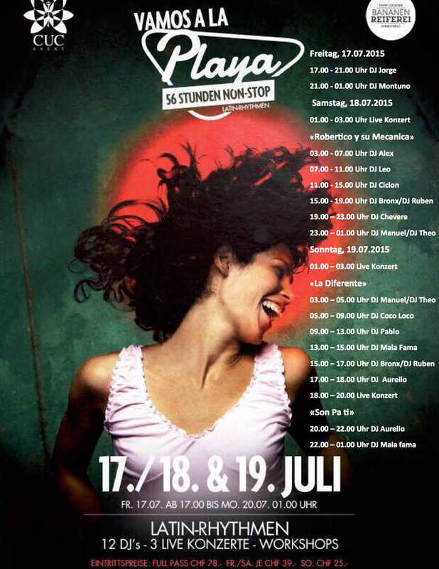 CUC EVENT und Salsarica präsentieren in der Bananenreiferei in Zürich am 17./18. und 19. Juli 2015 "Vamos a la Playa", DIE 56 Stunden Nonstop-Party! Erlebt während drei Tagen und drei Nächten ein musikalisches Feuerwerk in einem einzigartigen karibischen Ambiente! Dies wird ein einmaliger und unvergesslicher Sommer mit "Vamos a la Playa", die noch nie zuvor dagewesene Nonstop-Party in Zürich. Drei Konzerte "a lo latino" 12 Djs Unzählige Workshops Mediterrane Köstlichkeiten Und vieles mehr... Eintrittspreise: Full Pass CHF 78.00 ihr spart 25%! Freitag CHF 39.00 Samstag CHF 39.00 Sonntag CHF 25.00