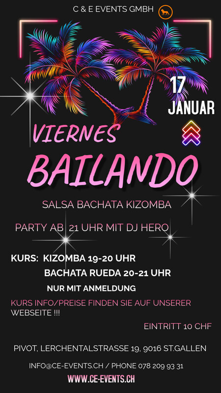 Lasst uns abtanzen und das Leben feiern am Freitag den 17. Januar im Pivot in St.Gallen!! Kizomba Kurs jeden Freitag von 19 - 20 Uhr Bachata Rueda Kurs von 20 - 21 Uhr Info/Preise über unsere Kurse finden sie auf unserer Webseite!!! Kurse nur mit Anmeldung Party ab 21.00 Uhr mit DJ Hero Party Eintritt 10 CHF Anmeldung und Infos: Phone 078 209 93 31 oder per Mail an info@ce-events.ch Wir freuen uns auf einen schönen Abend mit Euch! https://ce-events.ch