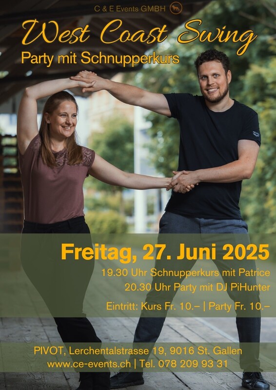 Lasst uns abtanzen und das Leben feiern am 27. Juni im Pivot bei unserer ersten West Coast Swing Party :-) Zum ersten Mal findet im Pivot St. Gallen eine West Coast Swing Party statt. Vor der Party gibt es einen Schnupperkurs, offen für alle, die den Tanz kennenlernen möchten. Im Anschluss geht es direkt weiter mit der Party. Workshop mit Patrice von 19.30 - 20.30 Uhr Party ab 20.30 Uhr mit 2 Floor Main Floor: DJ: Pi Hunter West Coast Swing 2. Floor DJ Hero Salsa, Bachata, Kizomba, Discofox, Jive uvm. Eintritt Schnupperkurs: 10 CHF Eintritt Party: 10 CHF An der Bar gibt es preiswerte Getränke. Wir bitten deshalb, keine eigenen Getränke mitzubringen. Wir freuen uns auf einen tollen Tanzabend mit euch :-) Anmeldungen unter: info@ce-events.ch oder Phone 078 209 93 31 Euer C & E Events GmbH / Pivot Team www.ce-events.ch