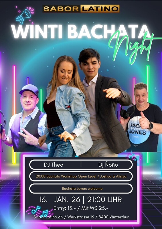 Winti Bachata Night – Salsa & Bachata im Sabor Latino Feel the groove. Feel the connection. 💫 Die Winti Bachata Night ist der Treffpunkt für alle Latin-Dance-Liebhaber:innen in Winterthur und Umgebung – ein Abend voller Musik, Gefühl und Club-Vibes im Sabor Latino. Die Party findet auf zwei Dancefloors statt: 🕺 Salsa Floor für alle, die klassische & moderne Salsa lieben 💃 Bachata Floor für pure Emotion, Flow und Connection So kannst du den ganzen Abend genau das tanzen, worauf du gerade Lust hast – oder einfach zwischen den Floors wechseln. Vor der Party startet der Abend um 20:00 Uhr mit einem Bachata Workshop (Open Level) mit Joshua & Alisiya, Schweizermeisterin in Bachata. Ideal zum Aufwärmen, Technik verbessern und um mit noch mehr Gefühl in die Party zu starten. Ab 21:00 Uhr gehört das Parkett ganz dir – mit fein selektierter Musik, entspannter Atmosphäre und einer offenen, tanzbegeisterten Community. Was dich erwartet: 🎶 Zwei Dancefloors: Bachata: DJ Ñoño Salsa: DJ Theo 💃🕺 Bachata Workshop ab 20:00 Uhr mit Joshua & Alisiya ✨ Schweizermeisterin Bachata live im Workshop 🍹 Bar, Garderobe & echte Club-Vibes 🕘 Party ab 21:00 Uhr Ob du zum Lernen kommst, zum Tanzen oder einfach zum Geniessen – Winti Bachata Night verbindet Musik, Bewegung und Leidenschaft. Workshop + Party: 25.– CHF ➡️ Anmeldung: bailemos.ch/bachata-workshop/ Nur Party: 15.- https://saborlatino.ch/events/winti-bachata-night-mit-bachata-workshop/