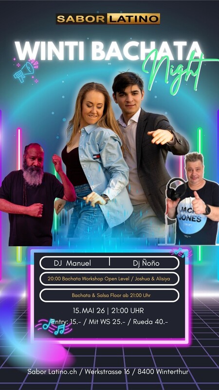 Winti Bachata Night – Salsa & Bachata im Sabor Latino Feel the groove. Feel the connection. 💫 Die Winti Bachata Night ist der Treffpunkt für alle Latin-Dance-Liebhaber:innen in Winterthur und Umgebung – ein Abend voller Musik, Gefühl und Club-Vibes im Sabor Latino. Die Party findet auf zwei Dancefloors statt: 🕺 Salsa Floor für alle, die klassische & moderne Salsa lieben 💃 Bachata Floor für pure Emotion, Flow und Connection So kannst du den ganzen Abend genau das tanzen, worauf du gerade Lust hast – oder einfach zwischen den Floors wechseln. Vor der Party startet der Abend um 20:00 Uhr mit einem Bachata Workshop (Open Level) mit Joshua & Leandra. Ideal zum Aufwärmen, Technik verbessern und um mit noch mehr Gefühl in die Party zu starten. Ab 21:00 Uhr gehört das Parkett ganz dir – mit fein selektierter Musik, entspannter Atmosphäre und einer offenen, tanzbegeisterten Community. Was dich erwartet: 🎶 Zwei Dancefloors: Bachata: DJ Ñoño Salsa: DJ Manuel 💃🕺 Bachata Workshop ab 20:00 Uhr mit Joshua & Alisiya ✨ Schweizermeisterin Bachata live im Workshop 🍹 Bar, Garderobe & echte Club-Vibes 🕘 Party ab 21:00 Uhr Ob du zum Lernen kommst, zum Tanzen oder einfach zum Geniessen – Winti Bachata Night verbindet Musik, Bewegung und Leidenschaft. Workshop + Party: 25.– CHF ➡️ Anmeldung: bailemos.ch/bachata-workshop/ Nur Party: 15.- https://saborlatino.ch/events/winti-bachata-night-mit-bachata-workshop/