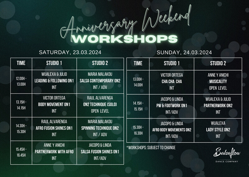 Wir feiern unseren sechsjährigen Geburtstag und möchten auch dieses Jahr mit Euch feiern und organisieren daher eine Party und ein Workshop Weekend am 23. und 24. März 2024 ! Da wir immer wieder mit weltbekannten TänzerInnen arbeiten, werden wir einige von ihnen an diesem Wochenende erneut bei uns Willkommen heissen. Die Workshops finden am Samstag 23. März & Sonntag 24. März im Salsaflow DC Tanzstudio an de Elisabethenanlage 7, 4051 Basel statt. Wir bieten verschiedenste Salsakurse On1 und On2 Kurse für alle Levels an. Schau dir den Workshopplan an und melde dich rechtzeitig an - die Plätze sind limitiert! Weitere Infos auf unserer Website und Link zum Vorverkauf für die Party Tickets! PS: Der Fullpass lohnt sich am meisten, so kostet euch jeder Workshop nur CHF 20.- und der Party Eintritt ist inklusive! https://www.salsaflow-dc.com/spezialprogramm/salsaflow-s-jubil%C3%A4um-weekend/